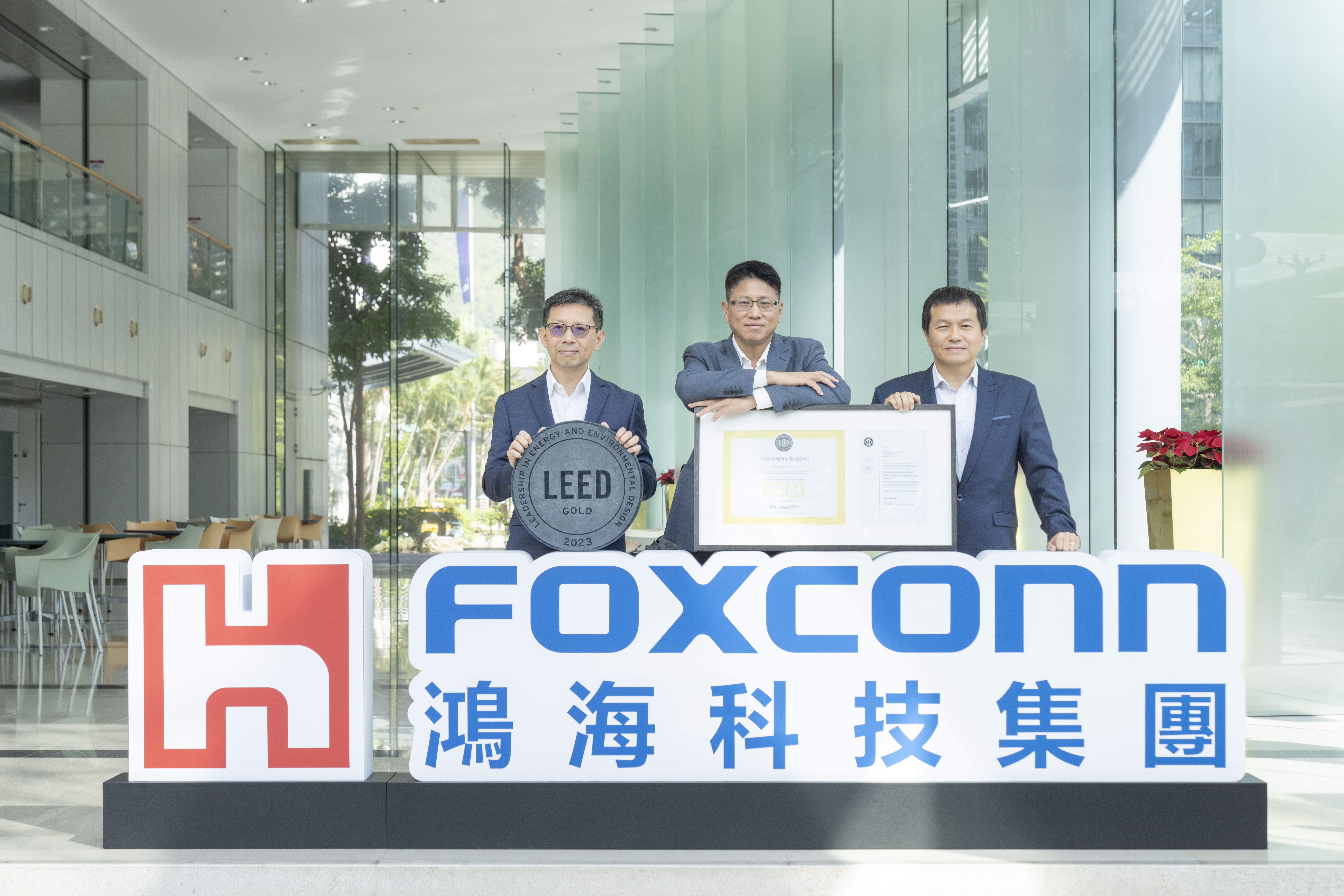 (鴻海科技集團宣布,經過近一年的改善優化努力,集團位於台北市內湖科技園區內超過20年歷史的內湖大樓,已於近期取得美國綠建築協會LEED既有建築黃金級認證。這是鴻海在台灣第一個獲得LEED認證的廠區!鴻海巫俊毅發言人(中)、洪榮聰環保長(右)、中央總務梁立信資深處長(左)與標章一同合影。)