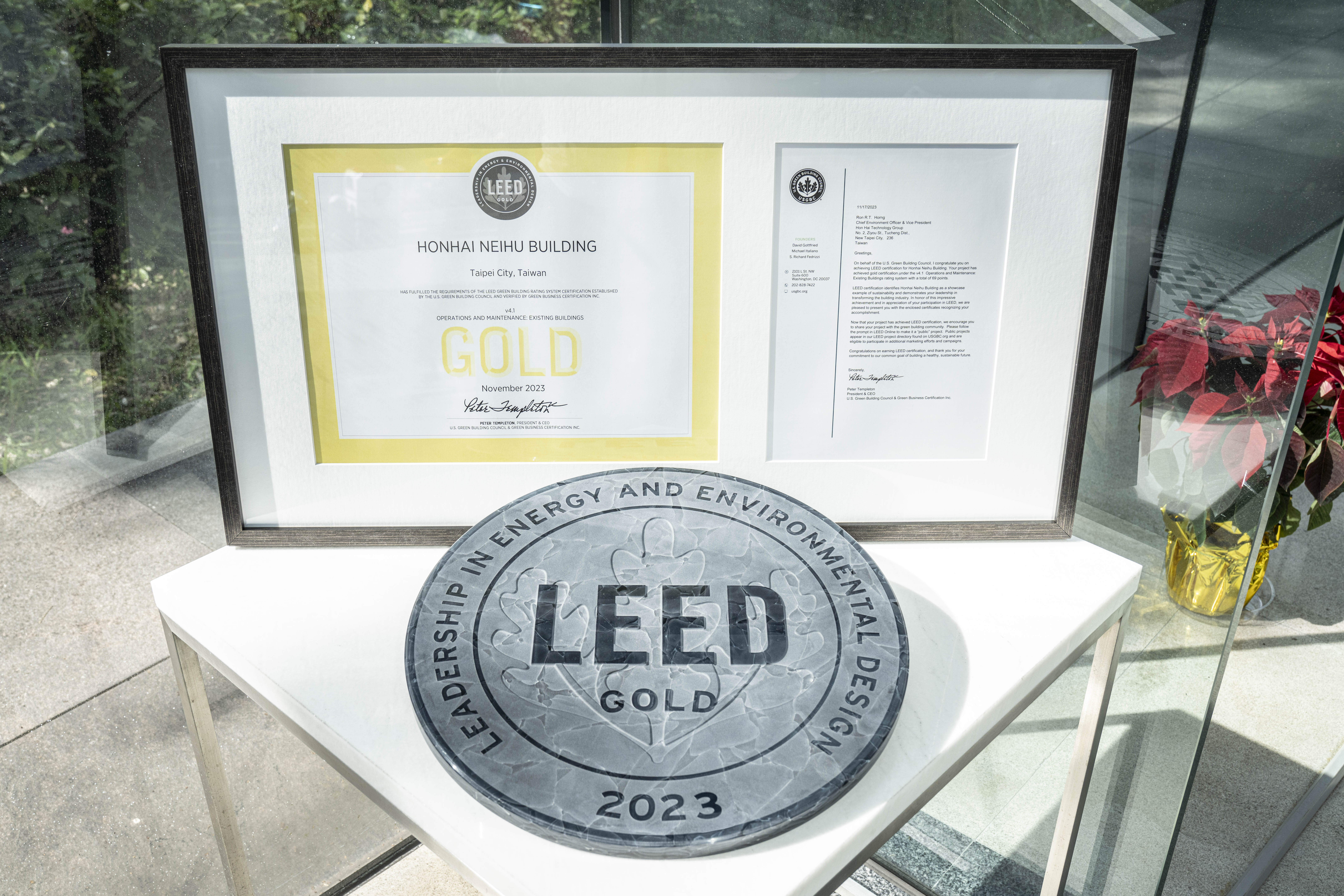 【台灣台北–2023年12月21日】鴻海科技集團(TWSE:2317)宣布,經過近一年的改善優化努力,集團位於台北市內湖科技園區內超過20年歷史的內湖大樓,已於近期取得美國綠建築協會LEED既有建築黃金級認證。這是鴻海在台灣第一個獲得LEED認證的廠區,也是繼虎躍總部獲得健康建築Fitwel認證、UL 2799廢棄物零填埋「鉑金級」認證後,兩年內在台灣拿到的第三項職場環境認證,同時也是集團雙E方程式「永續經營= EPS + ESG」的最佳實踐。